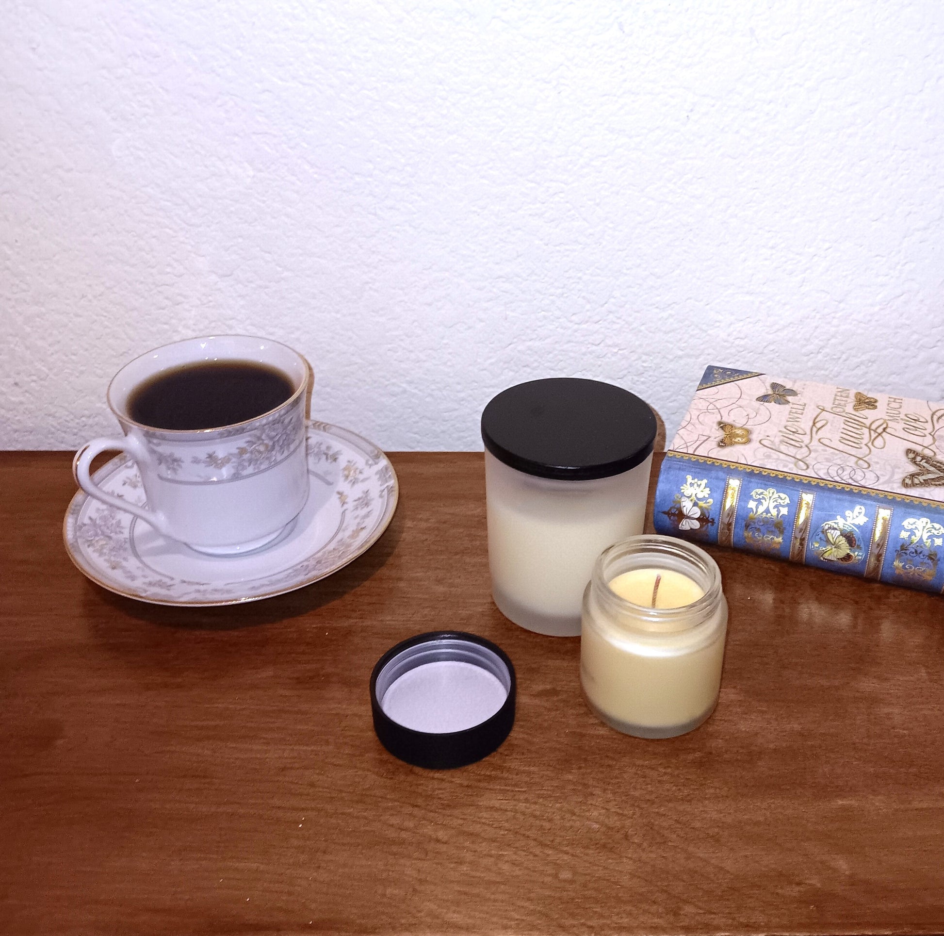 Medium is a 4.5 oz Net Wt candle with a minimum of 45 hour burn time.