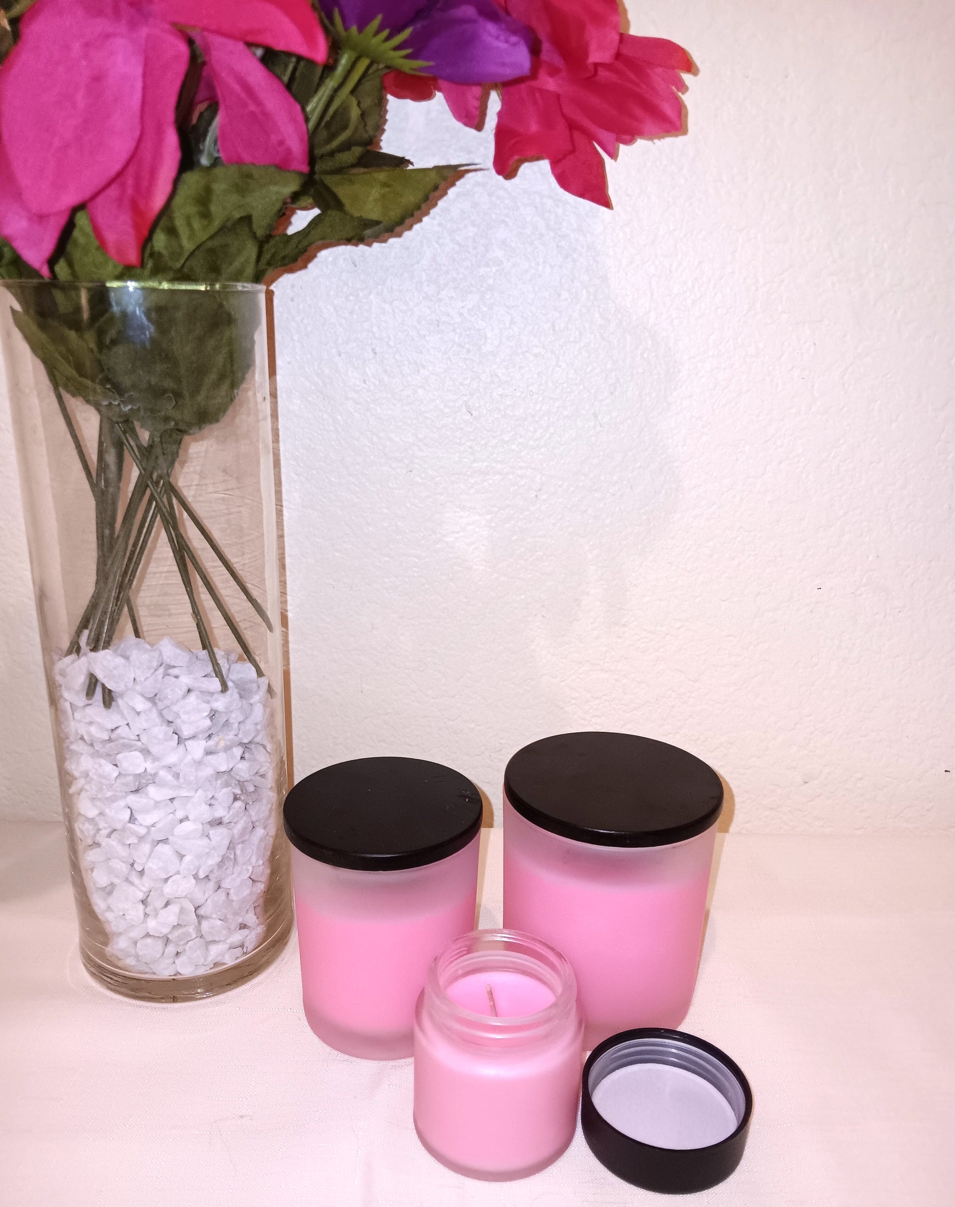 Medium is a 4.5 oz Net Wt candle with a minimum of 45 hour burn time.