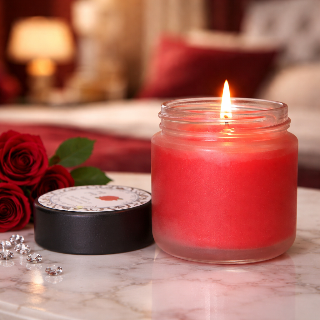 This candle opens with golden honey and rich rose, unfolding into a refined floral heart of jasmine and lily. The scent settles into a warm base of amber, earthy woods, and patchouli, enriched with pure rose essential oil.